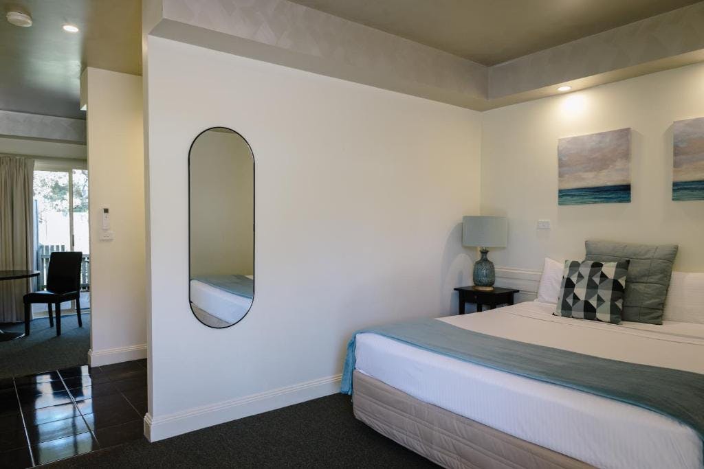 Divided into 3 zones and connected by a central walkway our Executive Suites are stylish rooms perfect for leisure and corporate guests. Park out front and enter your Suite with king size bed and flat screen smart television in the bedroom, walk on through past your shower ensuite bathroom, to your light filled lounge room with couch, table and chairs for two guests and relaxing courtyard. The perfect place to enjoy a glass of wine after a busy day exploring the Peninsula.